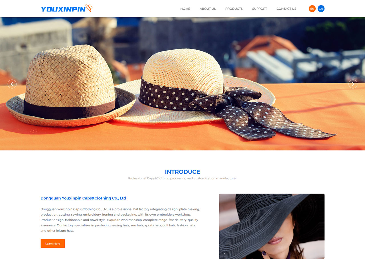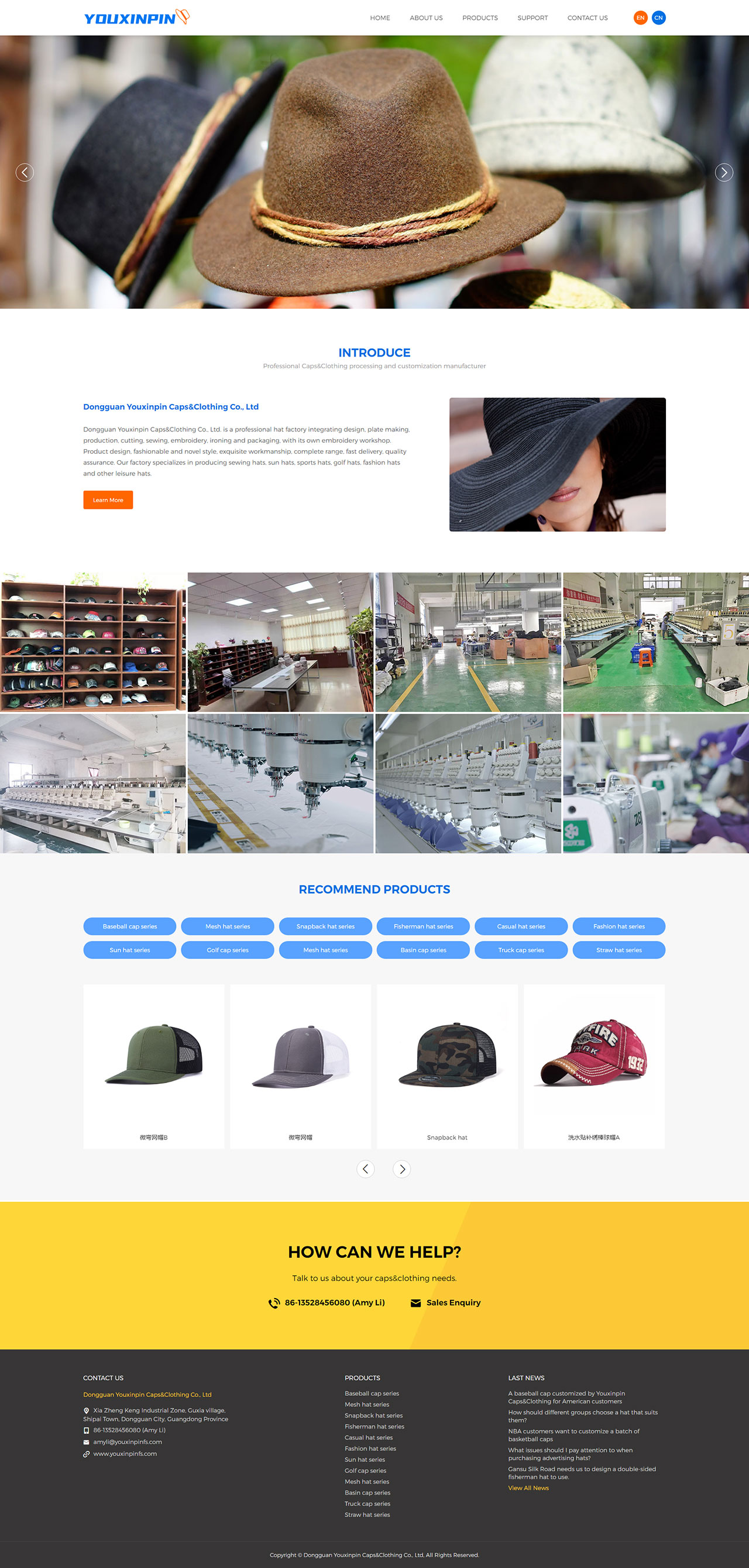 服務內容:外貿網站建設、英文網站建設 Dongguan Youxinpin Caps&Clothing Co., Ltd. is a professional hat factory integrating design, plate making, production, cutting, sewing, embroidery, ironing and packaging, with its own embroidery workshop. Product design, fashionable and novel style, exquisite workmanship, complete range, fast delivery, quality assurance.
